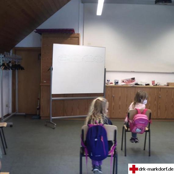 Wir haben den Kinder erklärt, wie sie sich bei einem Unfall verhalten sollen, wie man einen Notruf absetzt und wie die Seitenlage funktioniert. Außerdem konnten sie am Schluss noch Verbände am Ellenbogen und an der Hand anlegen.