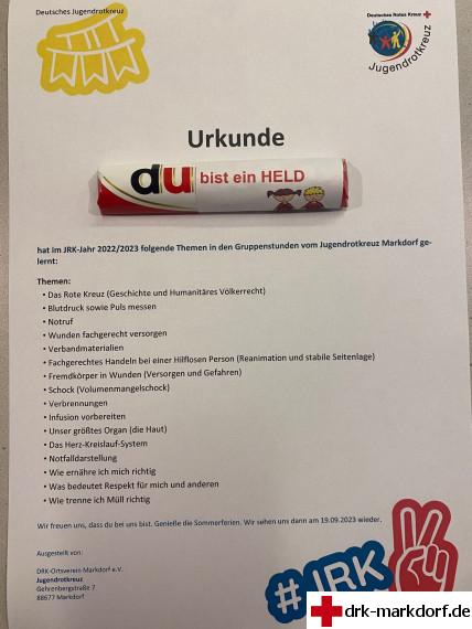 Jedes JRK-Mitglied hat eine Urkunde, ein Pflasterheft sowie ein „Du bist ein Held“- oder „Du bist eine Heldin“-Schokoriegel bekommen.