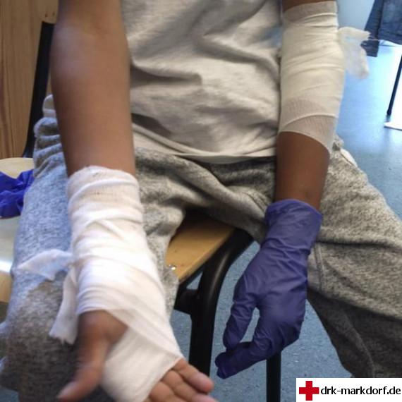 Wir haben den Kinder erklärt, wie sie sich bei einem Unfall verhalten sollen, wie man einen Notruf absetzt und wie die Seitenlage funktioniert. Außerdem konnten sie am Schluss noch Verbände am Ellenbogen und an der Hand anlegen.